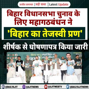बिहार विधानसभा चुनाव के लिए महागठबंधन ने 'बिहार का तेजस्वी प्रण' शीर्षक से घोषणापत्र किया जारी