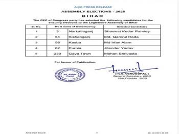 बिहार विधानसभा चुनाव के लिए कांग्रेस ने जारी की 5 उम्मीदवारों की सूची