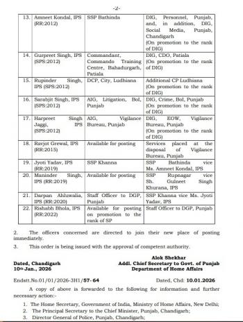 पंजाब सरकार के होम डिपार्टमेंट द्वारा IPS अधिकारियों के तबादले
